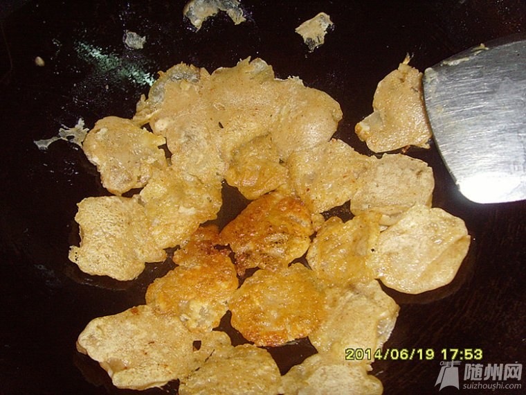 六)放入臘肉片、滾上面糊、油鍋放小火上煎成焦黃