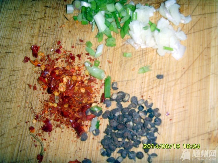 七)蔥花、蒜片、花椒、辣交入鍋煸香